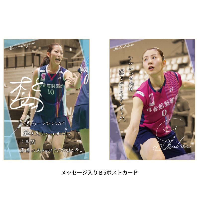 ファンへの感謝を伝える自筆サイン(印刷)とメッセージを載せた「メッセージ&サイン入りB5ポストカード」や4大会を振り返る「箔押し大型ポストカード」、日本代表ユニフォームを身にまとった二人がデザインされた「メモリアル・フェイスタオル」をセット。メモリアルホルダーにはプライベートでの笑顔あふれるツーショットやこれまでの名場面、戦績を掲載。
